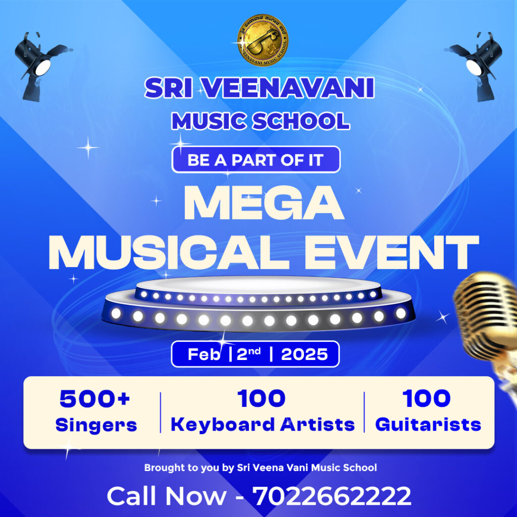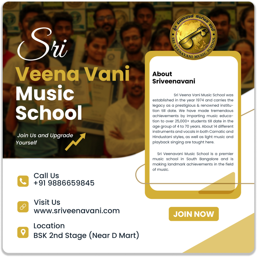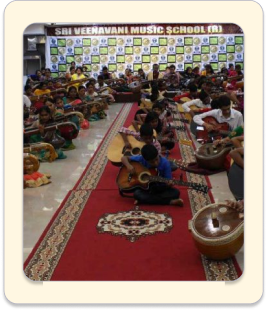 Guinness World Record holder, Sri Veena Vani Music School is a Premier Carnatic Classical Music School in South Bangalore and is currently making landmarks of achievements in the field of music. Having made tremendous achievements by imparting music education to over 20,000+ students till date from age groups varying 4yrs to 70yrs and teaching more than 14 different instruments and vocals in Carnatic and Hindustani Styles, Light Music and Playback Singing, The institution takes pride in birthing passions and perseverance for all aspiring students and enabling a platform in all musical facets.